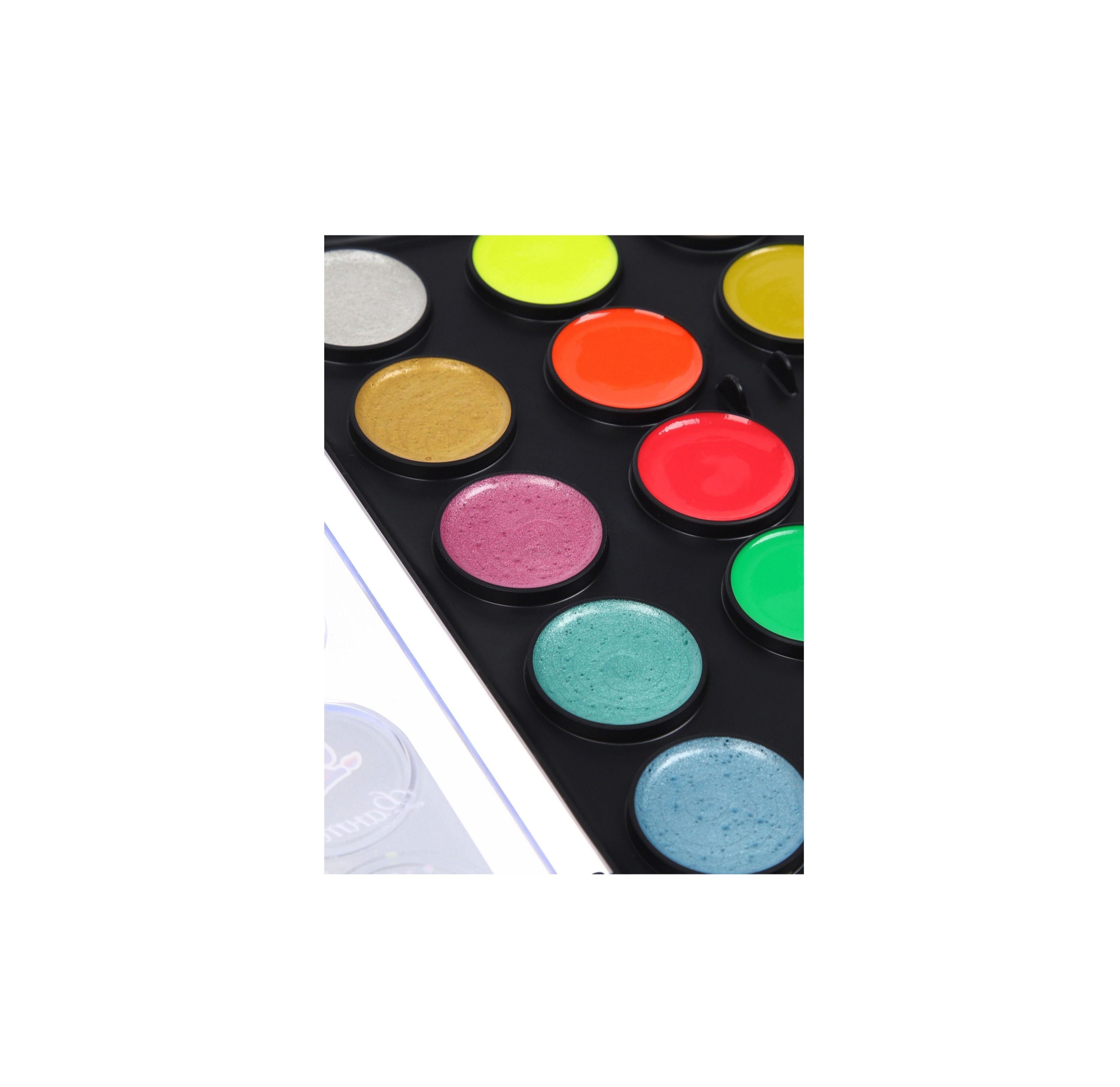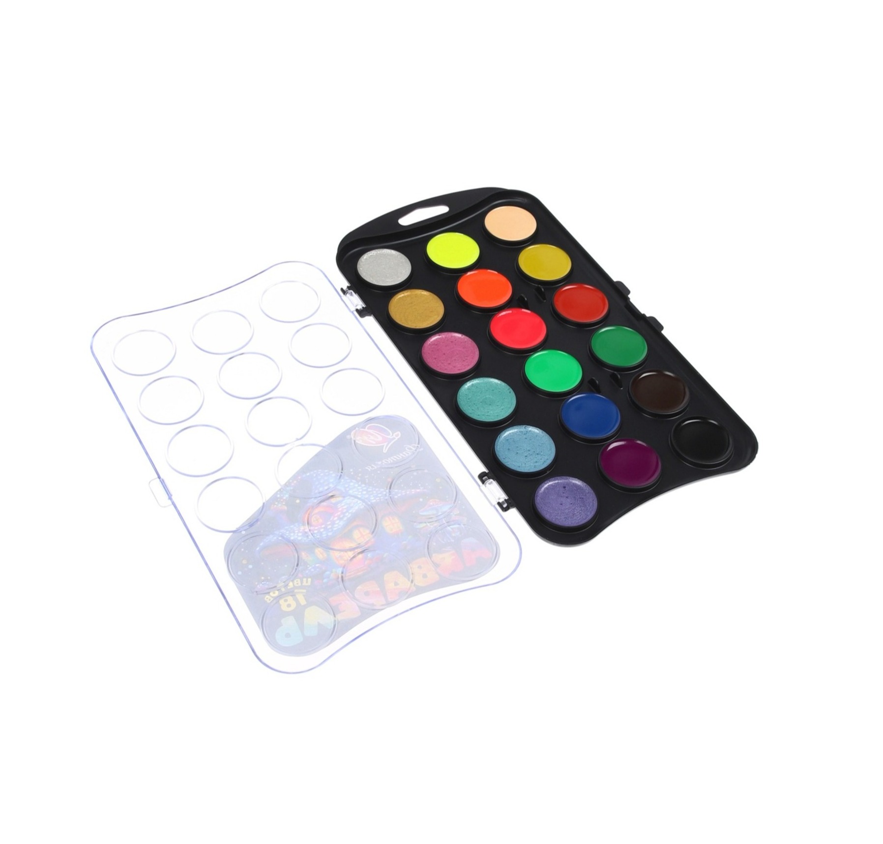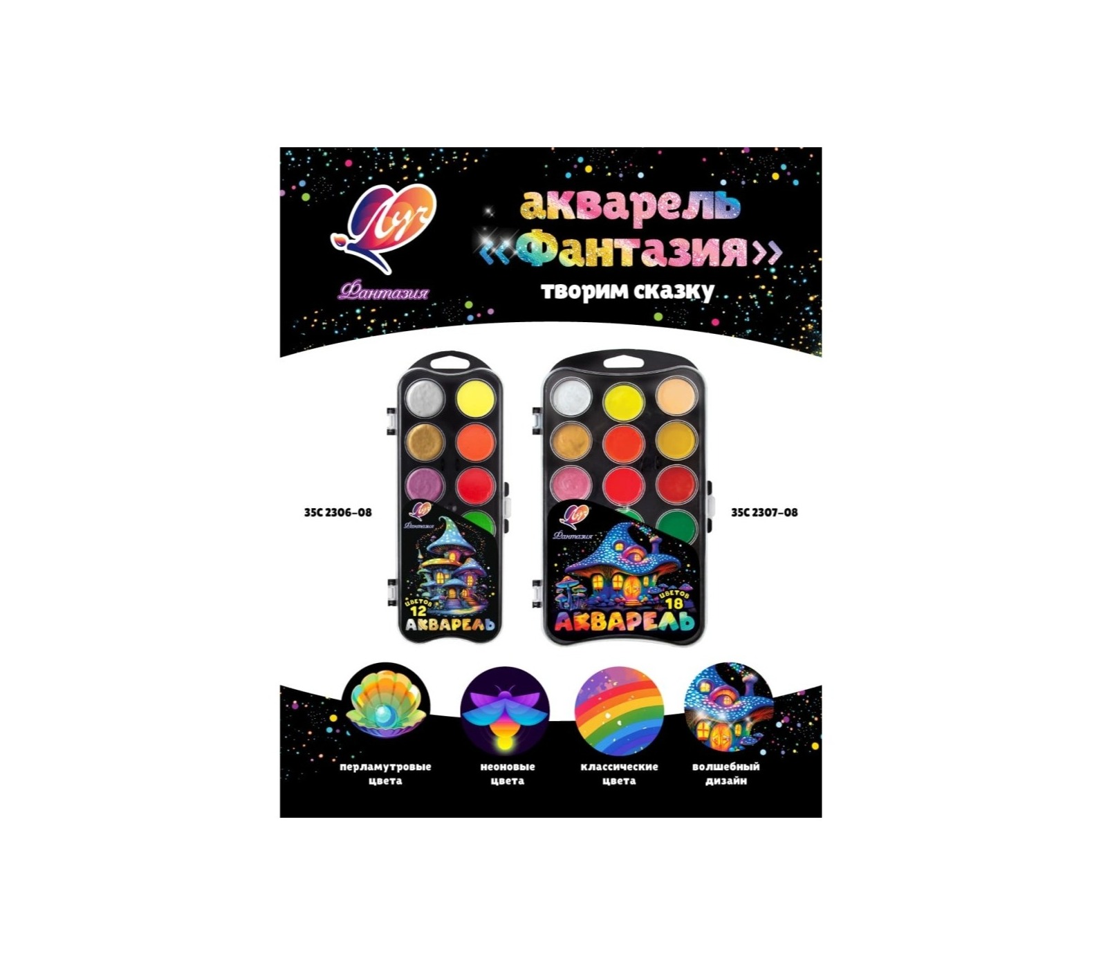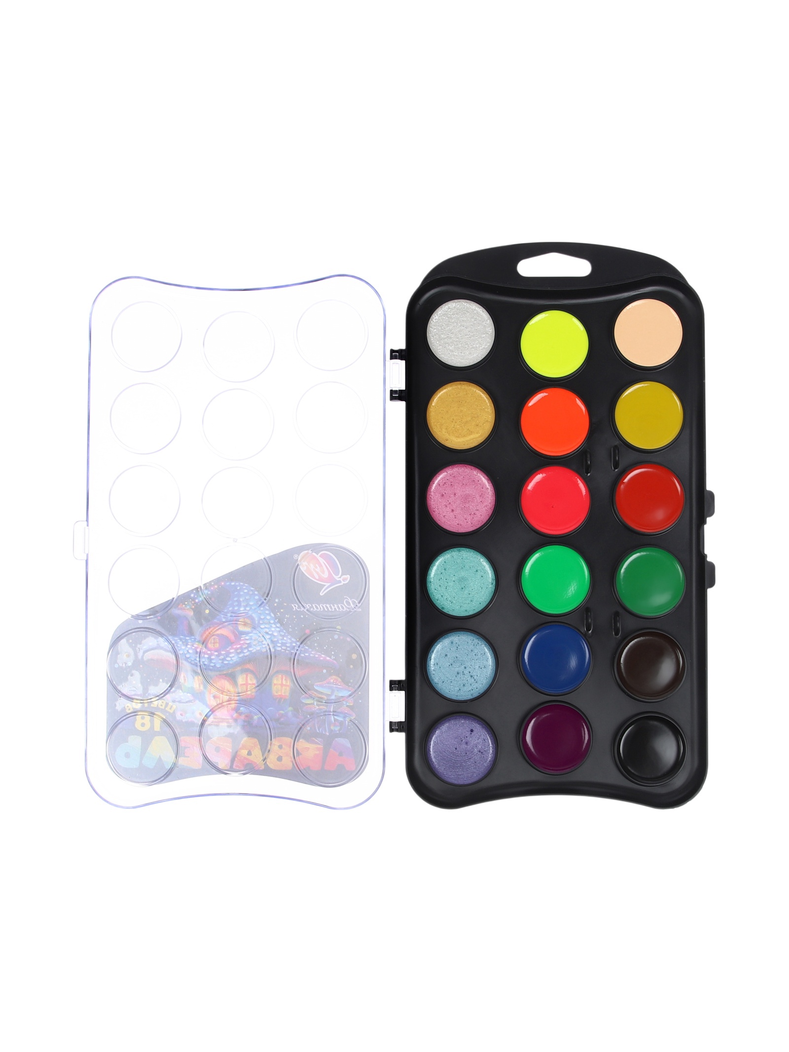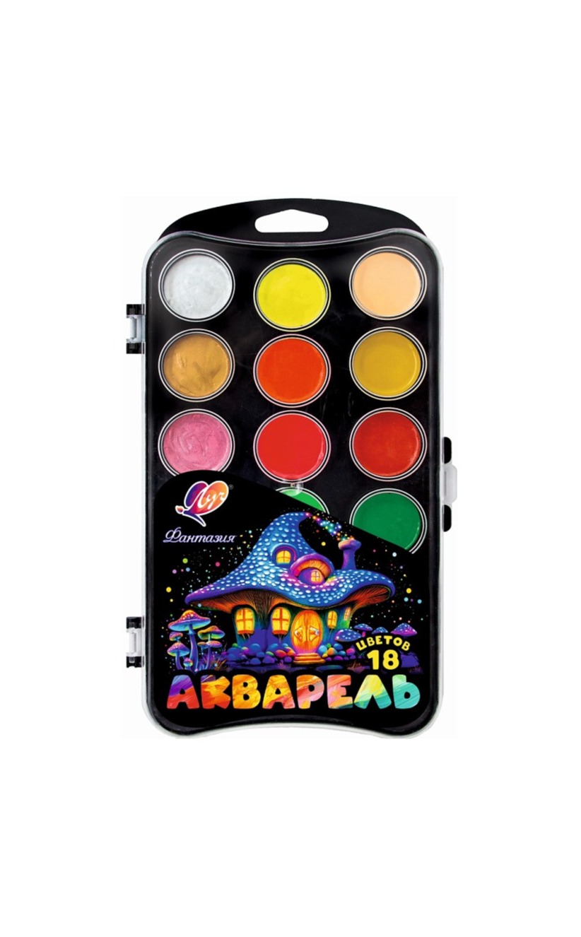 Набор акварели "Фантазия" включает в себя 6 классических, 6 неоновых и 6 перламутровых цветов. Краски разлиты в донышко чёрного цвета с европодвесом, прозрачная крышка.