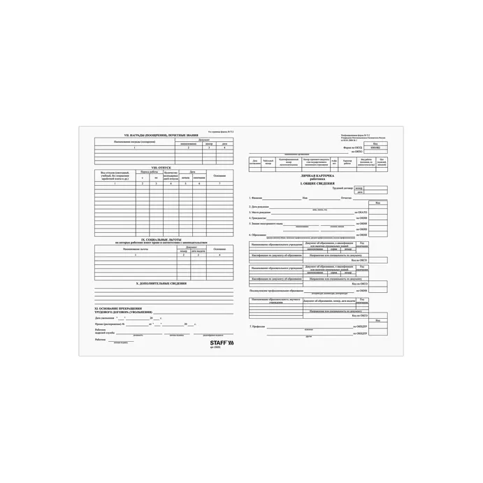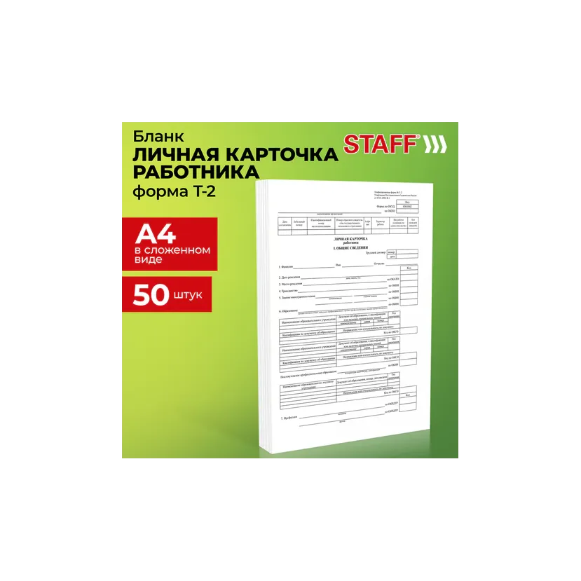 Cоответствуют государственным стандартам документального ведения учета. Бумага офсетная плотностью 120 г/м2. Бланк формата А4 состоит из 4 страниц. Cоответствует государственным стандартам документального ведения учета формы Т-2. Формат А4 (210х295 мм). Поставляется в комплекте по 50 штук в термоусадочной пленке (количество вложений 25 шт по 2 листа).
