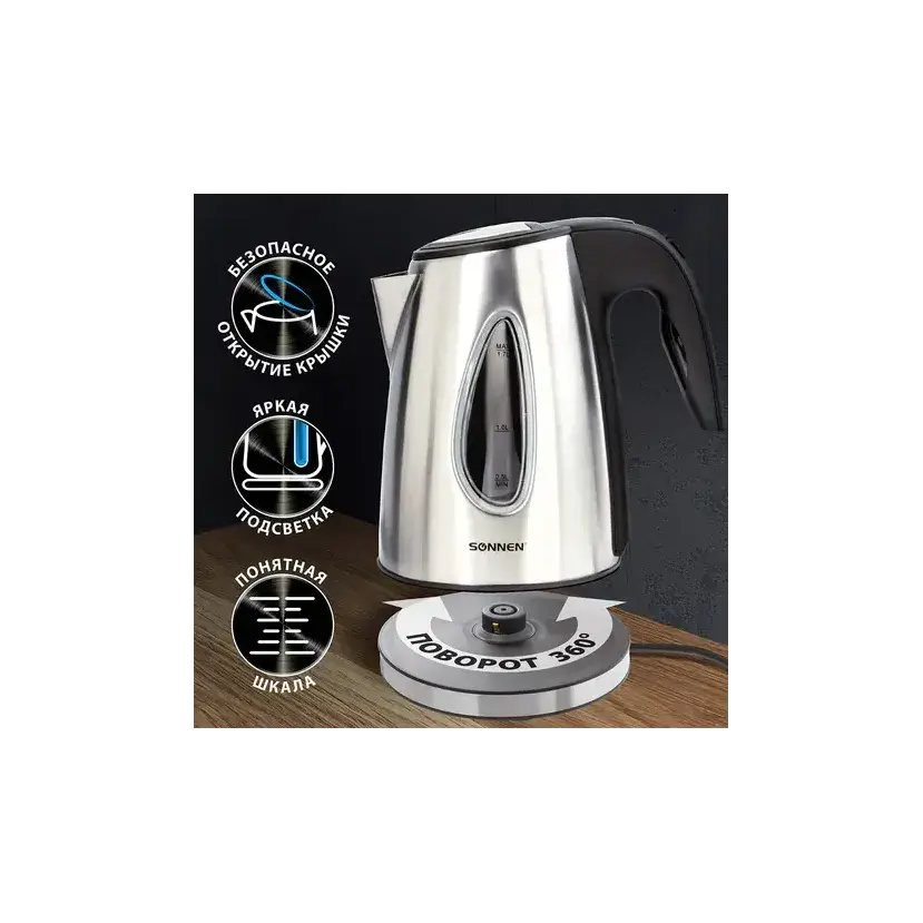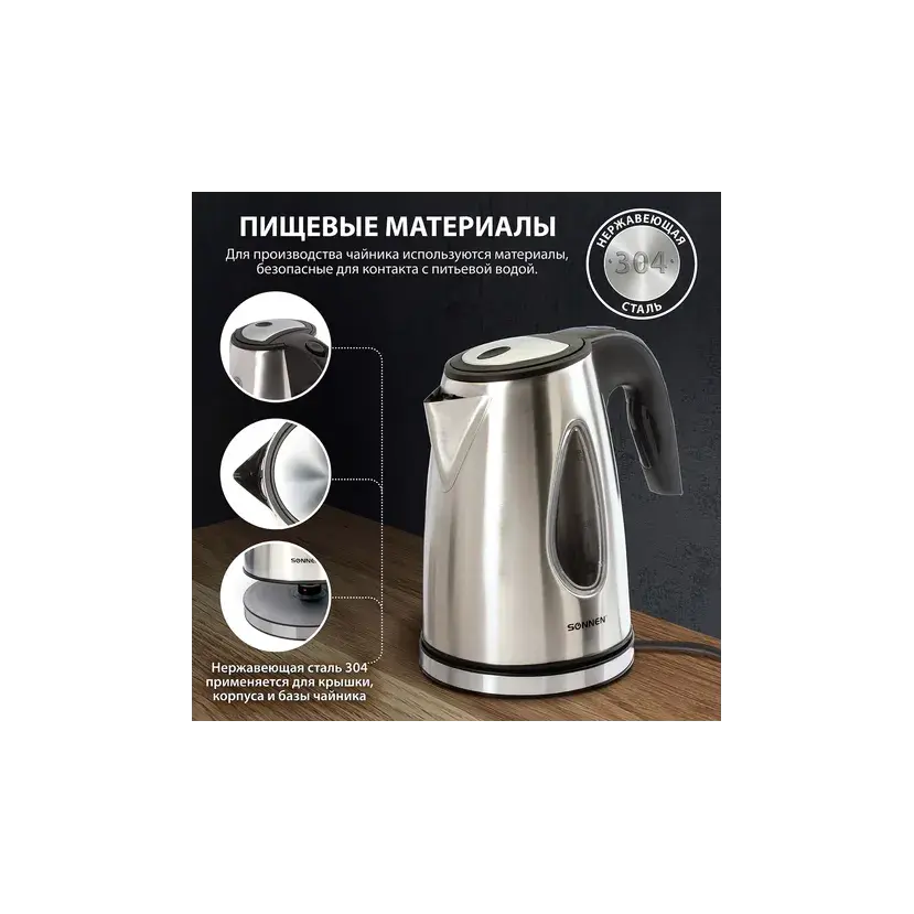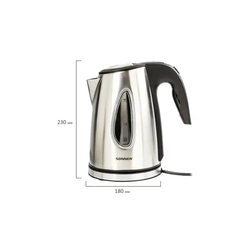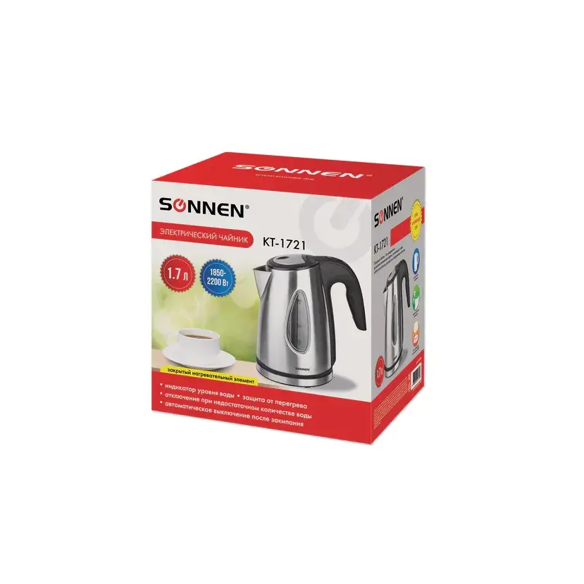 Чайник SONNEN KT-1721 отлично подойдет для эксплуатации как дома, так и в офисе. Прочный серебристый корпус из нержавеющей стали с черными вставками прекрасно впишется в любой интерьер.