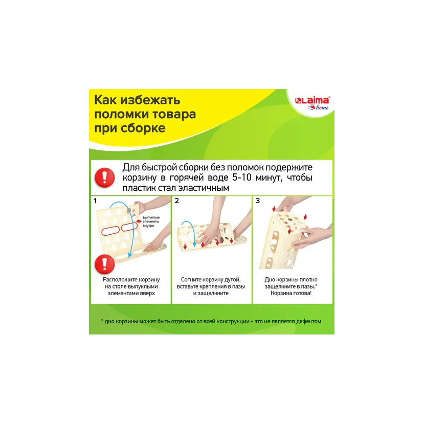 Корзинка поставляется в разобранном виде с прочными защелками. Сборка очень простая – достаточно согнуть в местах сгиба и защелкнуть защелки. Материал изделия гибкий, не подвержен растрескиванию на сгибах. Не имеет запаха и не требователен в уходе.