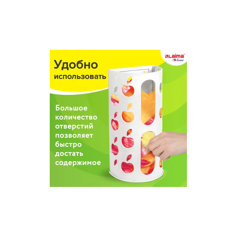 Держатель-диспенсер для пакетов LAIMA – это вместительное пластиковое приспособление для компактного и упорядоченного хранения бытовых пакетов, салфеток, тряпок, туалетной бумаги, бумажных полотенец, бахил, одноразовых тряпок и салфеток.