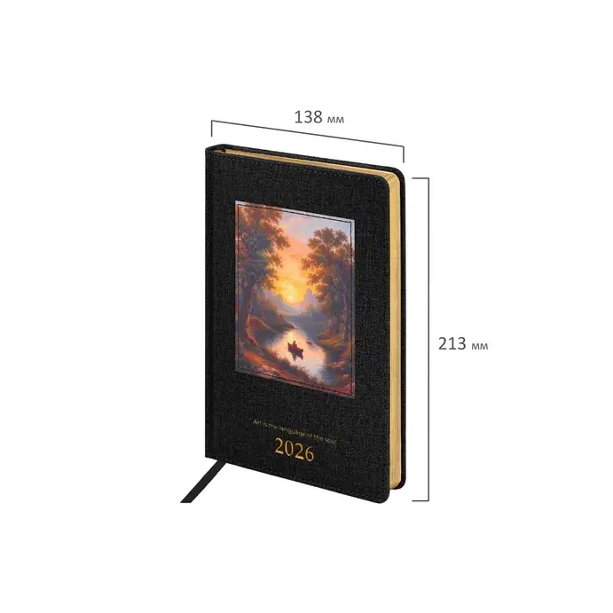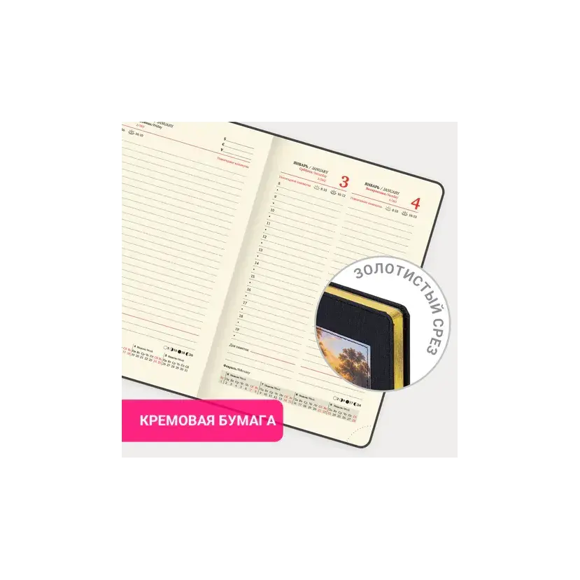 Внутренний блок включает 168 листов кремовой бумаги плотностью 70 г/м2. Каждая страничка имеет перфорированный угол. Благодаря стандартному формату А5 (138х213 мм) датированный ежедневник удобно использовать как в офисе, так и на выездных деловых встречах.