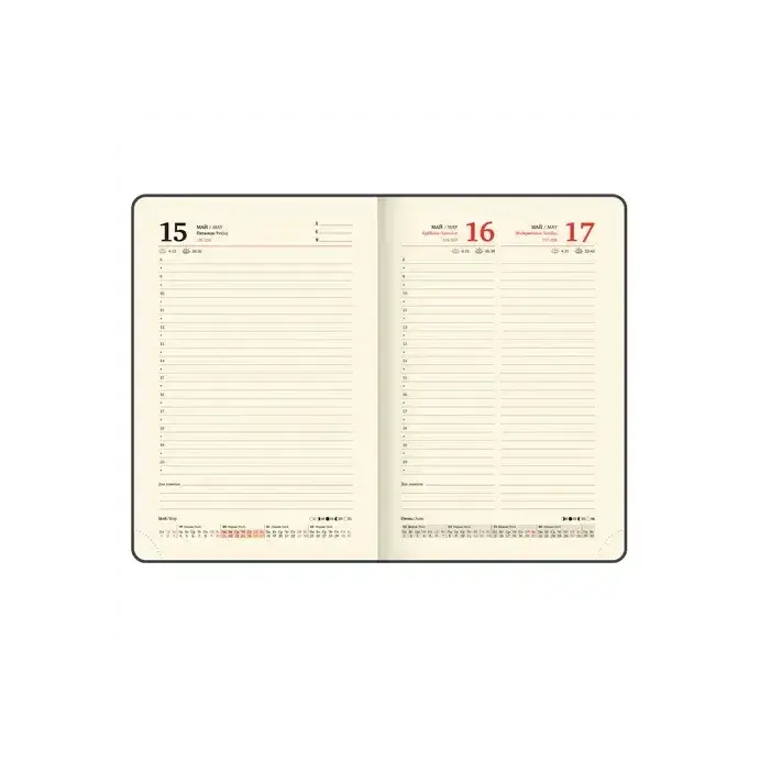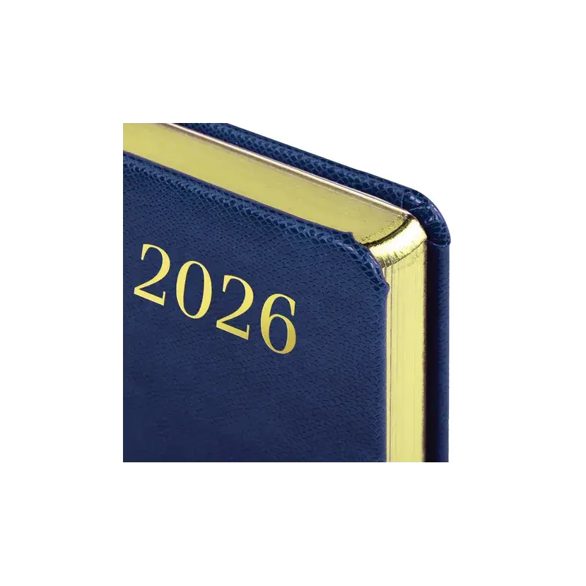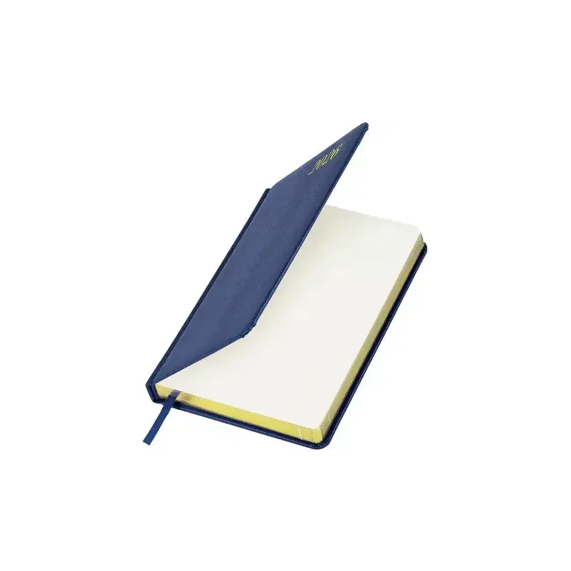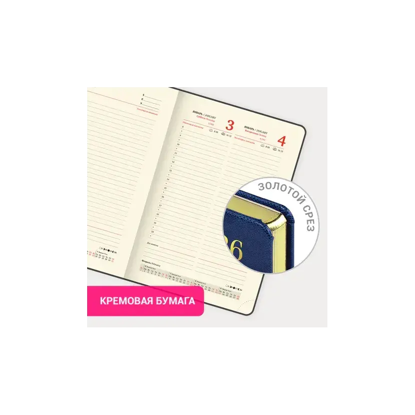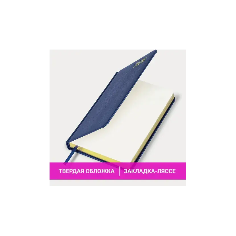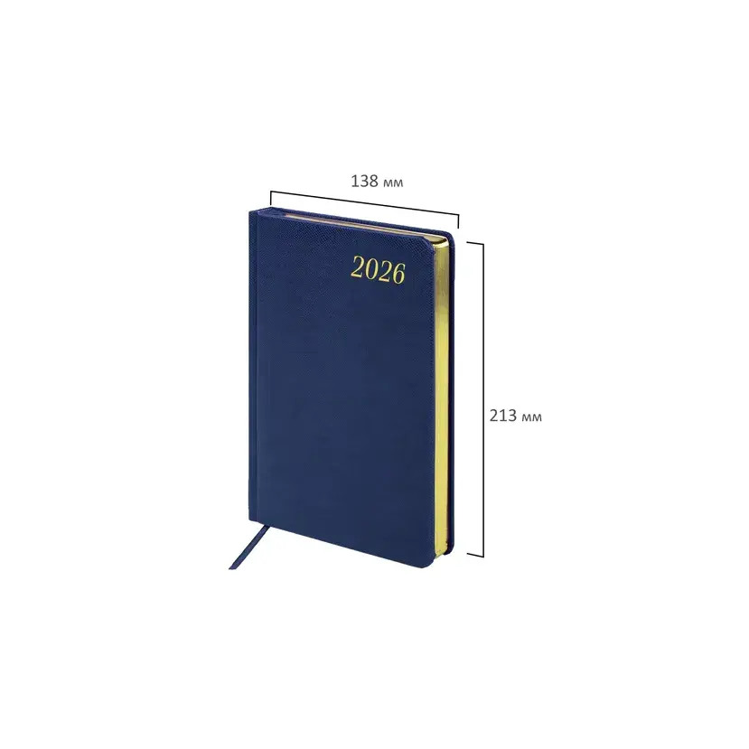 Внутренний блок включает 168 листов тонированной бумаги плотностью 70 г/м2. Каждая страничка имеет перфорированный угол. Благодаря стандартному формату А5 (138х213 мм) ежедневник удобно использовать как в офисе, так и на выездных деловых встречах. Твердая обложка стилизована под кожу рептилии насыщенного синего цвета. Подходит для горячего тиснения. Срез ежедневника фольгирован золотой фольгой, что придает ему особый шарм. Дополнением является закладка-ляссе, с помощью которой при необходимости можно быстро открыть ежедневник на нужной странице. Ежедневник снабжен обширным справочным материалом. В конце есть 4 страницы для записей и заметок.