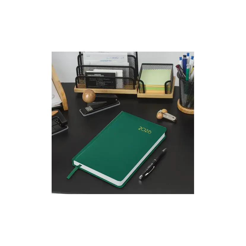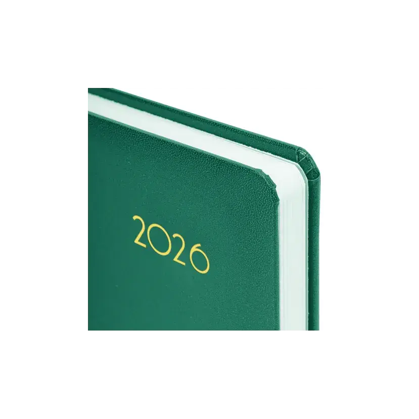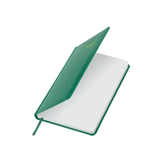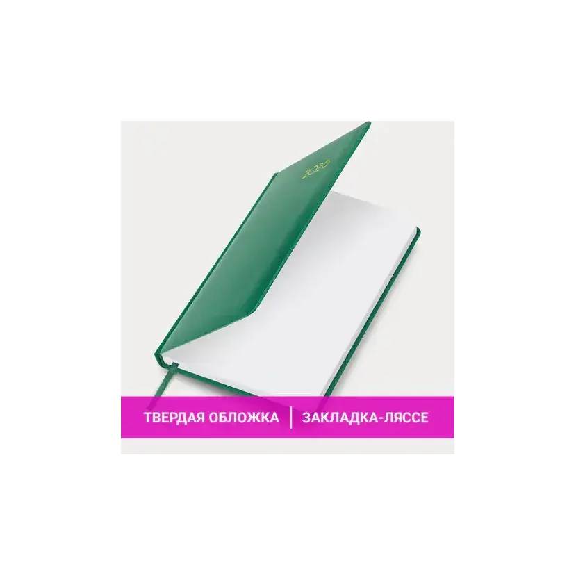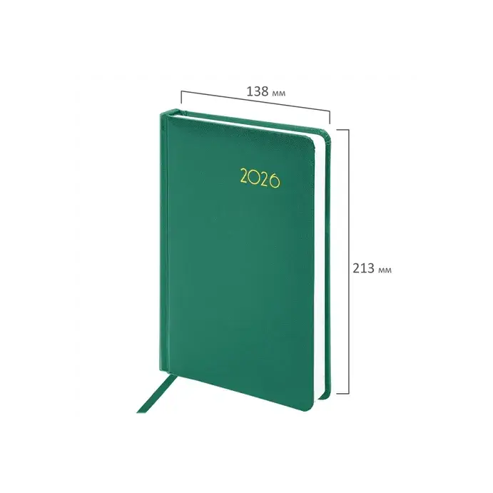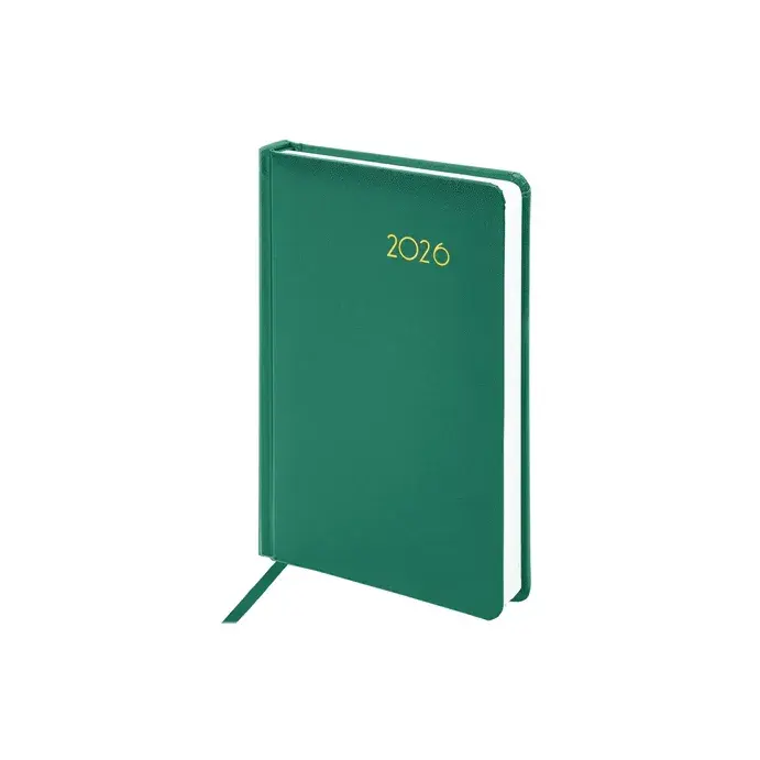 Жесткая книжная обложка цвета зеленой ели с легкой рельефной фактурой напоминает натуральную кожу. Материал обложки – балакрон, подходит для тиснения только фольгой. Дополнением является закладка-ляссе, с помощью которой при необходимости можно быстро открыть ежедневник на нужной странице. Обширный справочный материал дополнительно расширяет функциональность ежедневника. В конце внутреннего блока есть 4 страницы для записей и заметок.