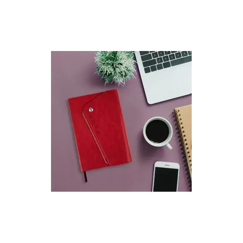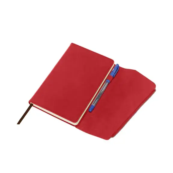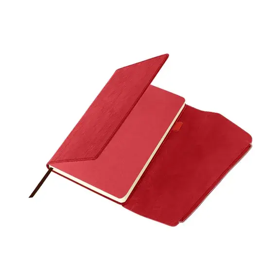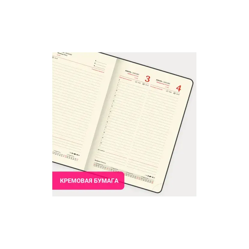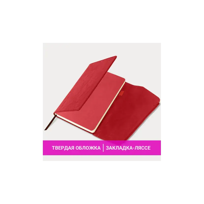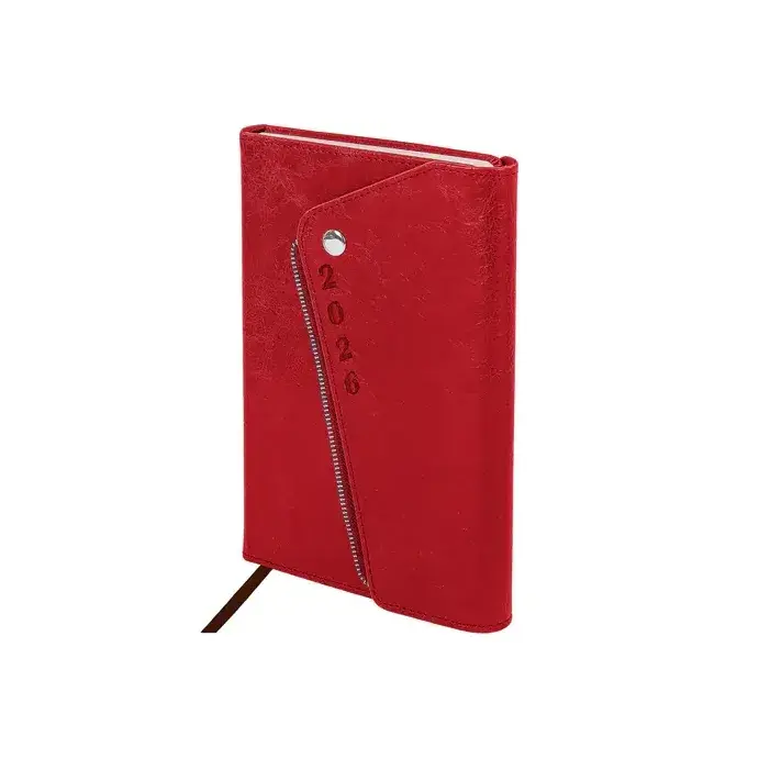 Твердая обложка стилизована под текстурную кожу и имеет интересную деталь в виде магнитного клапана декорированного молнией и кнопкой. Благодаря клапану ежедневник не откроется в сумке или портфеле. Подходит для горячего тиснения. Дополнениями являются закладка-ляссе, с помощью которой при необходимости можно быстро открыть ежедневник на нужной странице, и держатель для ручки. Справочный материал дополнительно расширяет функциональность ежедневника. В конце внутреннего блока есть 4 страницы для записей и заметок.