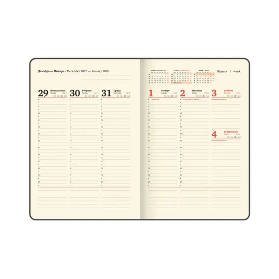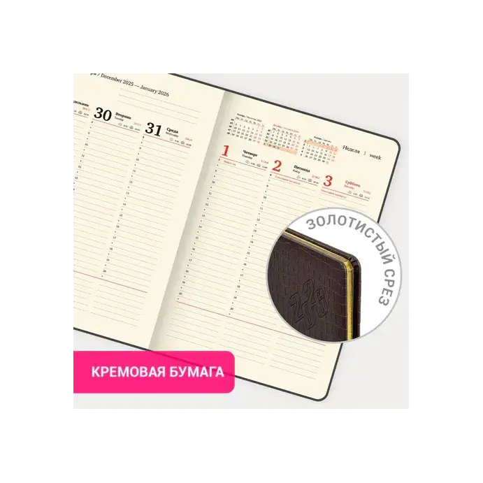 Дополнением является закладка-ляссе, с помощью которой при необходимости можно быстро открыть еженедельник на нужной странице. Для заметок в еженедельнике есть 7 страниц в конце внутреннего блока. Еженедельник снабжен обширным справочным материалом.