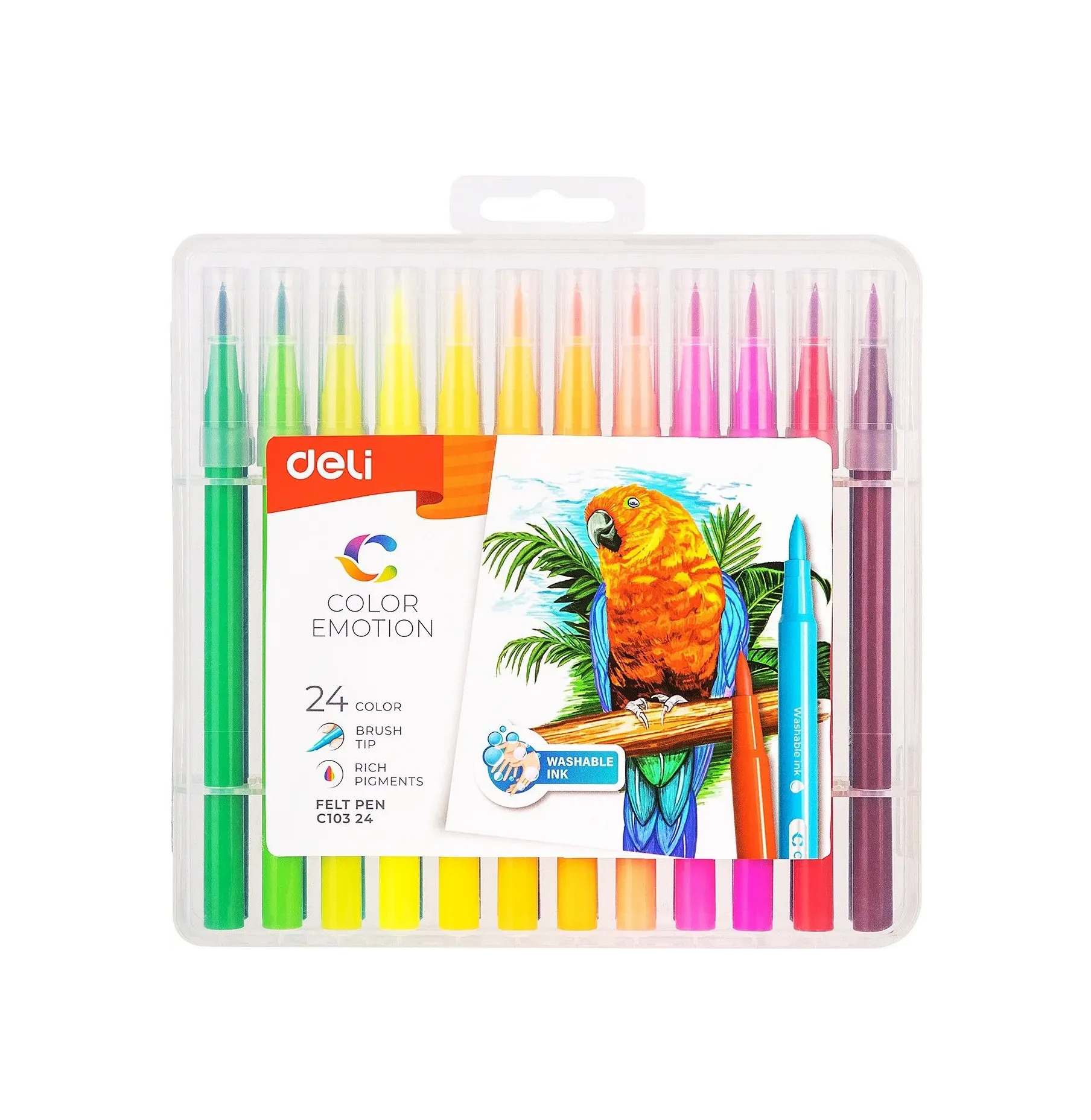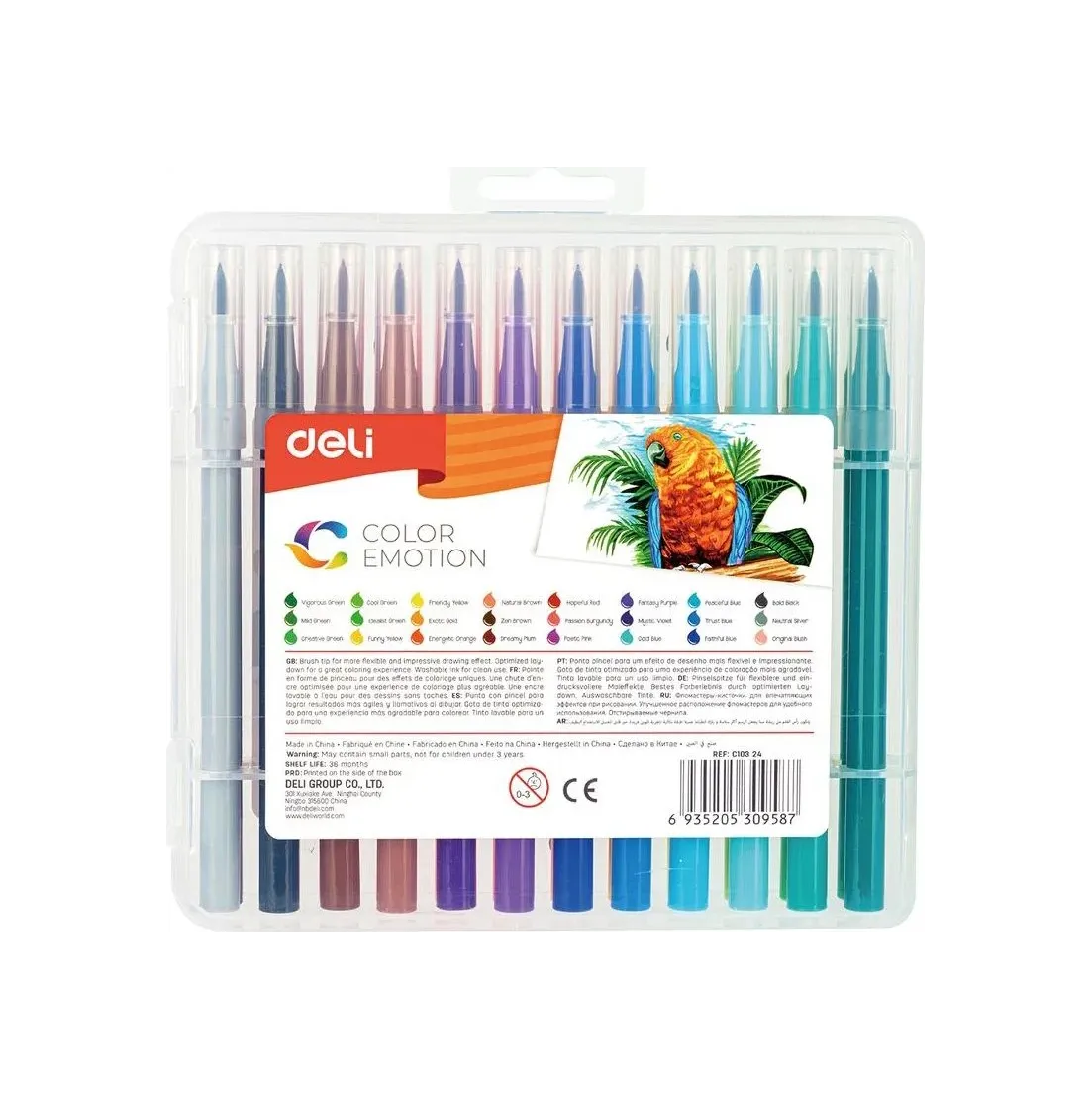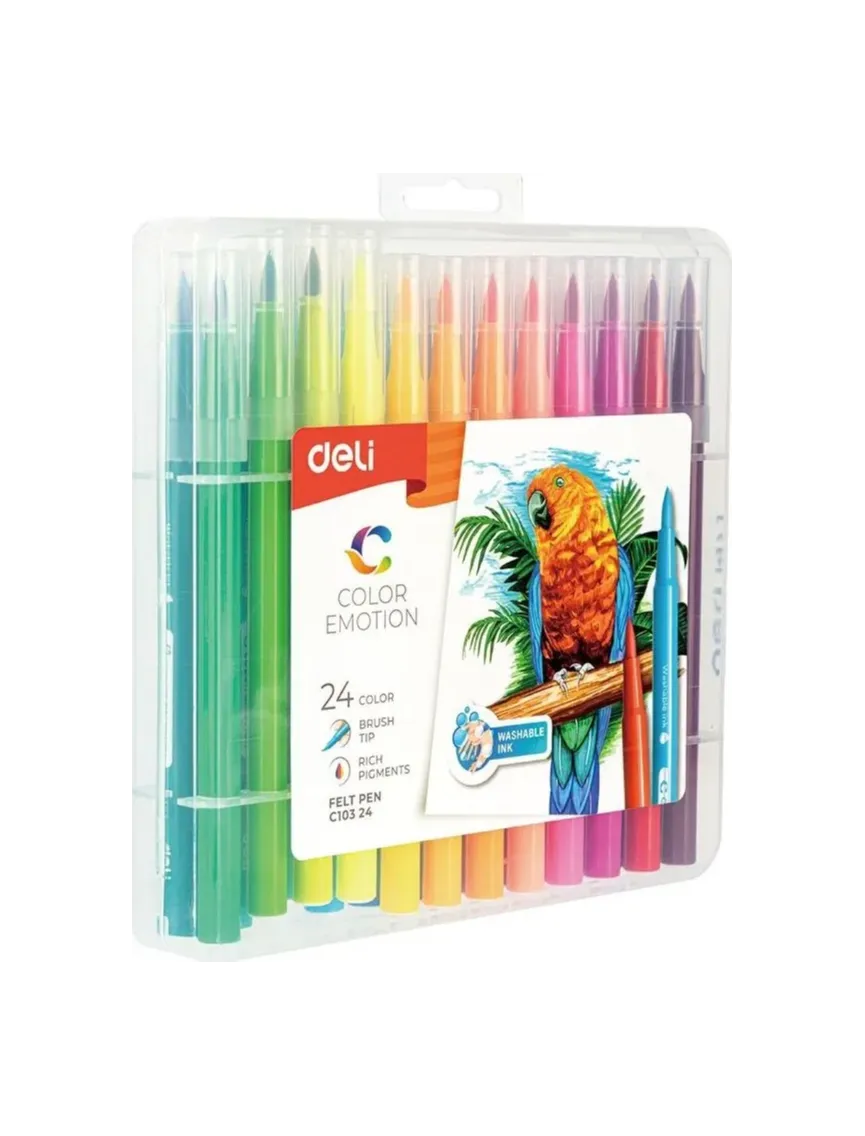 Фломастеры Deli Ec10324 Color Emotion — идеальный инструмент для творческих людей всех возрастов. В комплект входят 24 ярких и насыщенных цвета которые легко смешиваются друг с другом позволяя создавать уникальные оттенки. Кистевая форма наконечника обеспечивает плавное и точное нанесение что делает подходящими как для рисования так и для раскрашивания. Все фломастеры имеют смываемую основу что облегчает процесс очистки случайных пятен на одежде или поверхностях. Пластиковый пенал обеспечивает надежное хранение и транспортировку фломастеров а также упрощает организацию рабочего пространства. Идеально подходит для: Рисования раскрашивания создания открыток и других творческих проектов. Фломастеры Deli Ec10324 — отличный выбор для школ студий и домашнего использования!