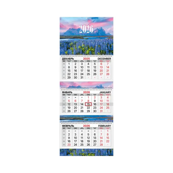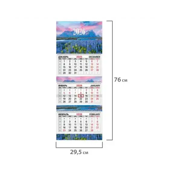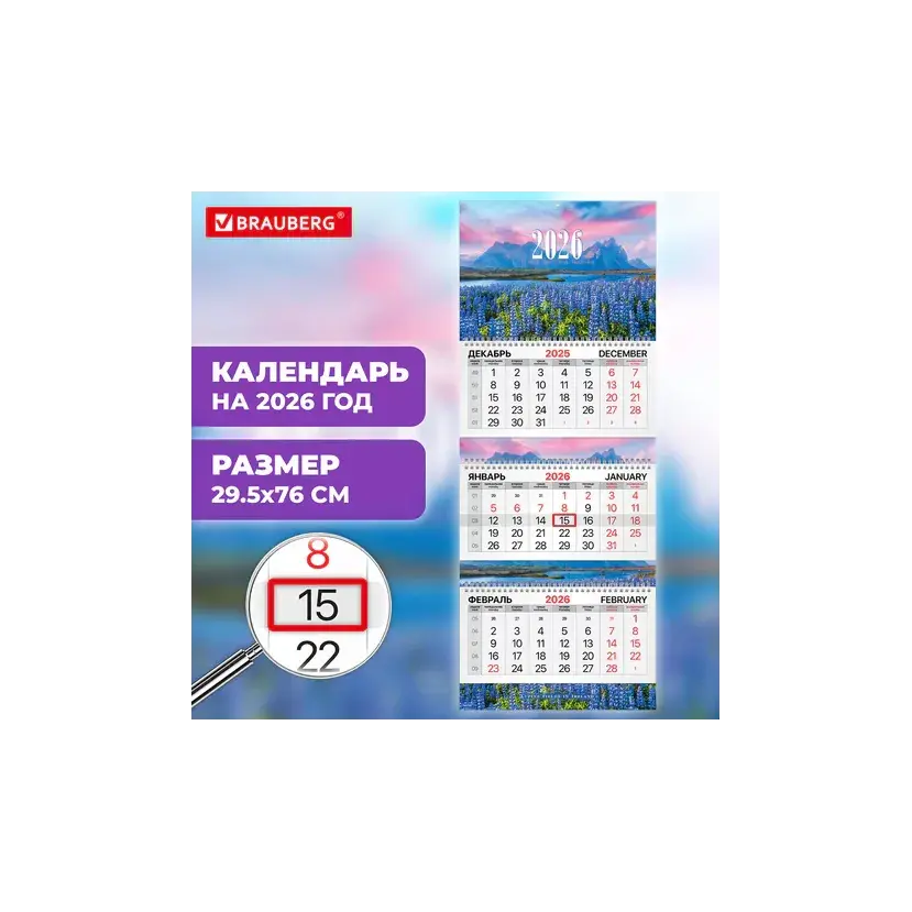 Квартальный календарь BRAUBERG EXTRA "Люпины" предназначен для делового планирования. Офисный календарь на 2026 год на 3 гребнях. Для удобства планирования состоит из 3 блоков с календарными сетками на три месяца – предыдущий, текущий и следующий. Курсор-бегунок выделяет текущую дату.