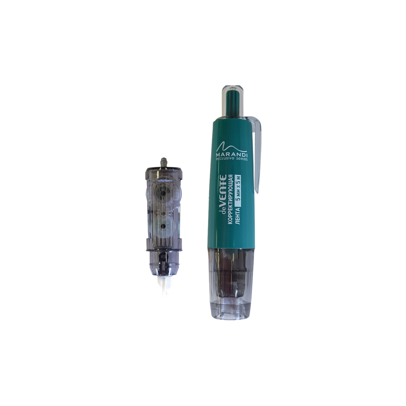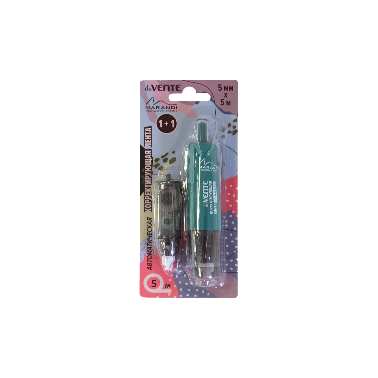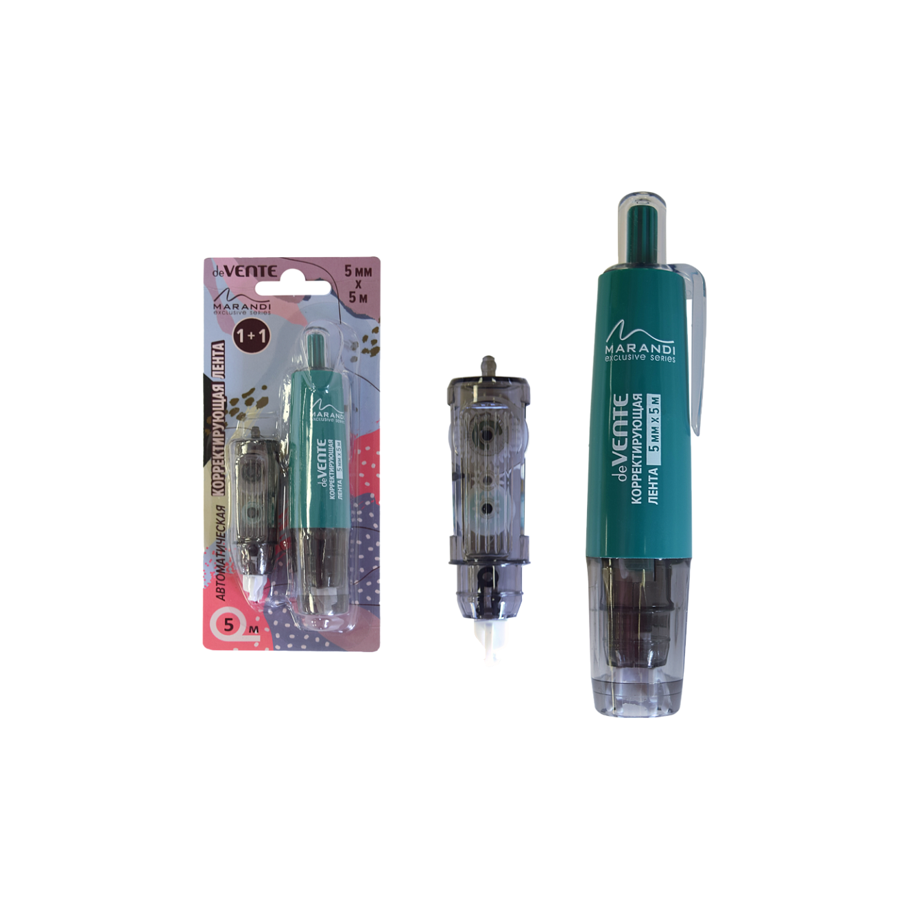 Корректирующая лента автоматическая "deVENTE. Marandi" 5 ммx5 м, полупрозрачный с бирюзовым корпус, фронтальный аппликатор, в комплтекте с сменным картриджем 5 ммx5 м, в картонном блистере. Автоматическая система подачи узла с лентой позволяют легко и незаметно исправлять любые копии, тексты и документы. Корректирующая лента не требует времени на высыхание после нанесения, что делает её особенно удобной в использовании. Кроме того, она не оставляет следов и черных полос на документе при копировании или отправке по факсу, обеспечивая плотное и равномерное покрытие.