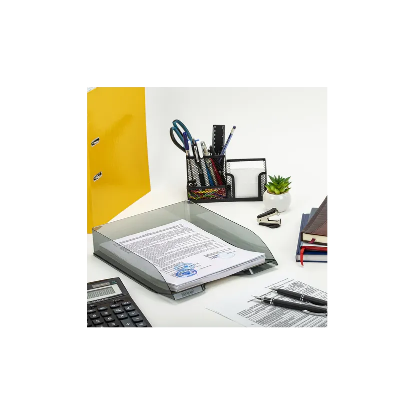 Легкий, прочный и компактный лоток для хранения документов формата А4. Сочетание глянцевой и матовой поверхностей. Лотки надежно устанавливаются друг на друга. Удобная транспортировка и хранение за счет укладки лотков один в другой.