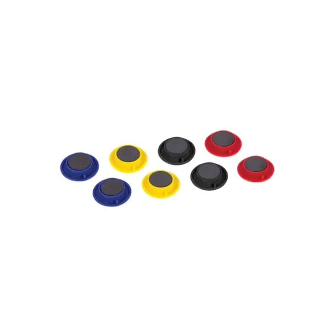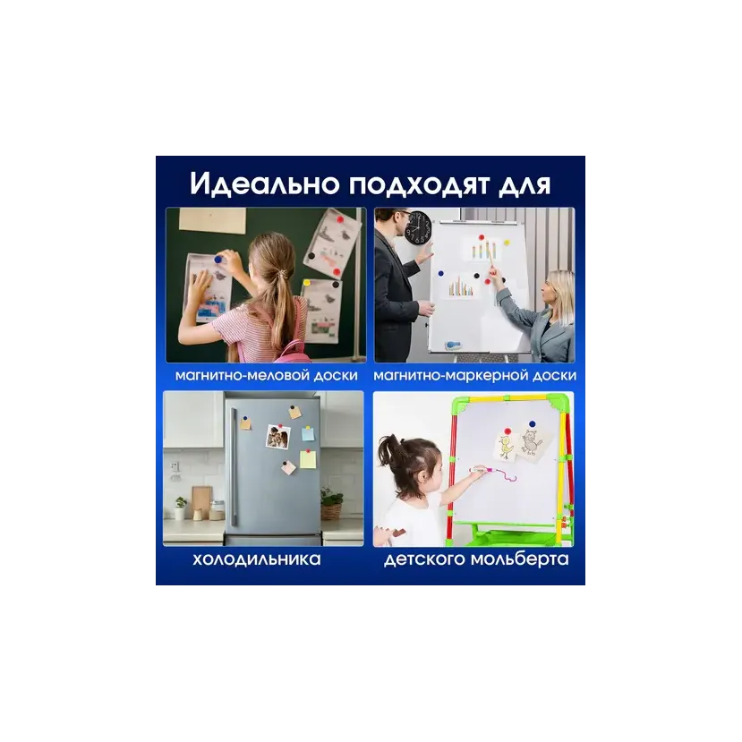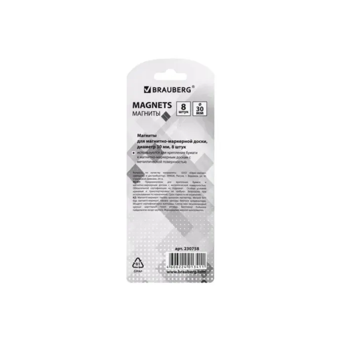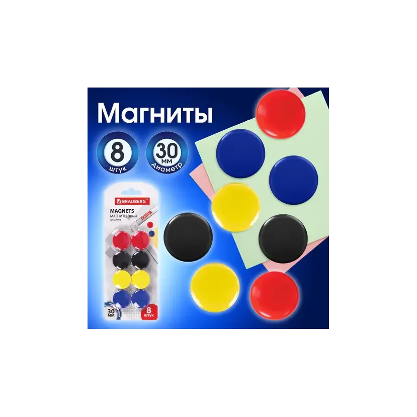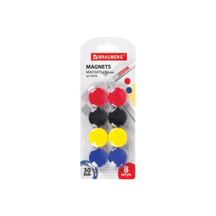 Магниты BRAUBERG круглой формы с пластиковым покрытием для магнитно-маркерных досок. Диаметр магнита составляет 30 мм. 8 штук в комплекте. Цвет – ассорти (красный, черный, желтый, синий) без возможности выбора. Разноцветные магниты помогут надежно прикрепить листы бумаги к магнитно-маркерной поверхности досок, витрин и флипчартов. Надежно удерживаются на любой железной или стальной поверхности. Поставляется в удобной блистерной упаковке с европодвесом.