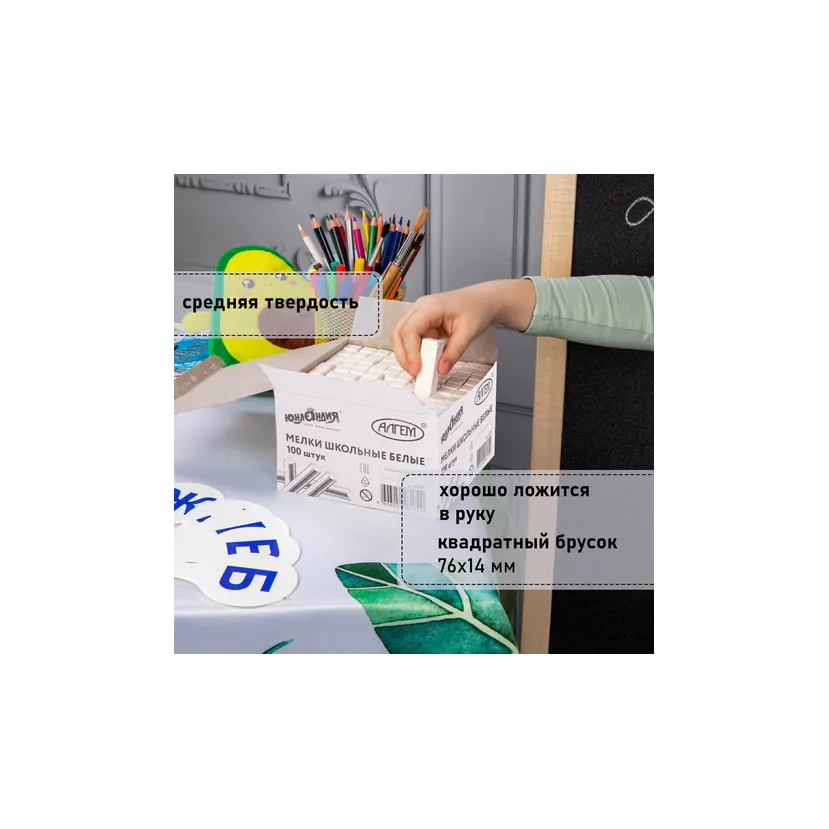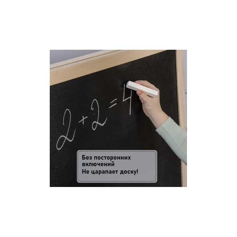 Изготовлен из высококачественного природного сырья без химических добавок. Не содержит твердых включений и не портит поверхность досок. Благодаря удобной квадратной форме легко ложится в руку. Мел средней твердости белого цвета. Не оставляет царапин. Легко смывается водой. Длина - 76 мм, диаметр - 14 мм. Поставляется в количестве 100 штук в картонной коробке.
