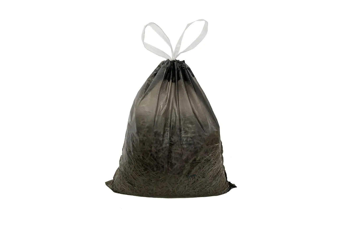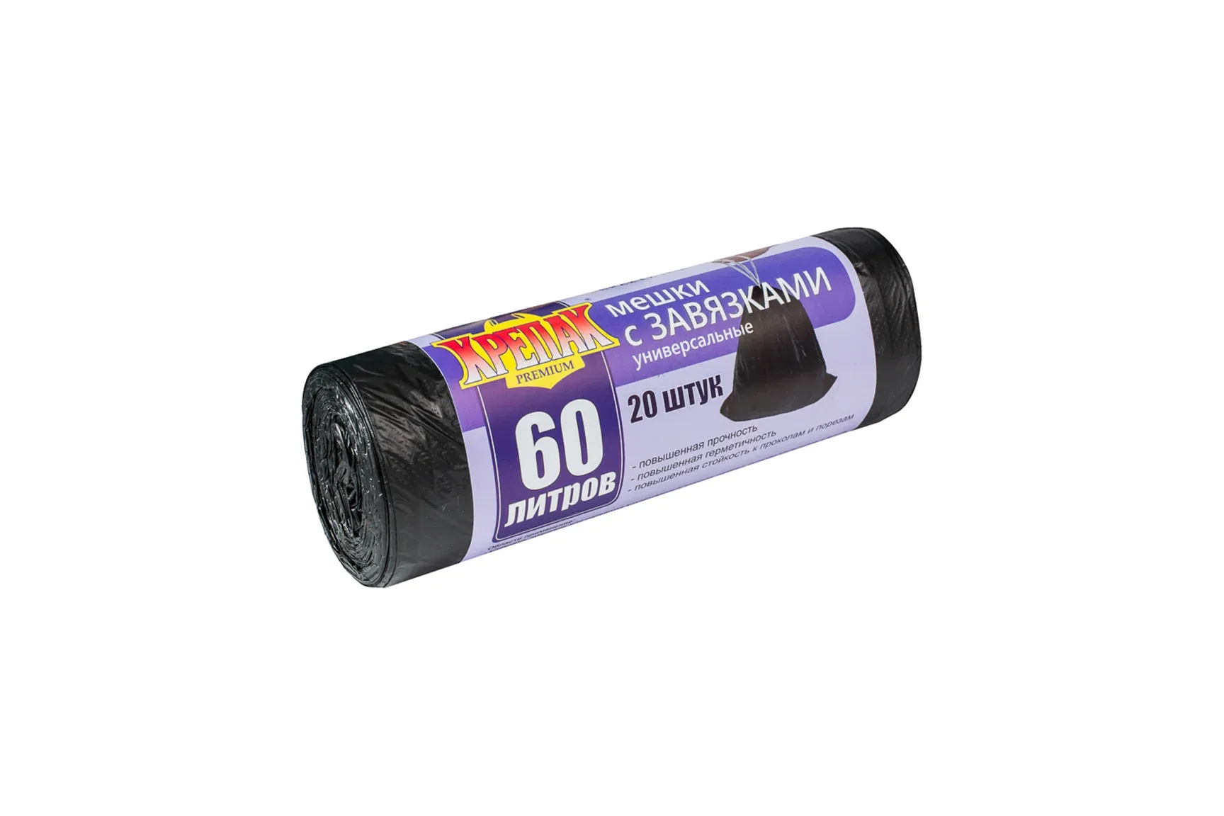 Мешки для мусора с завязками 60 л, 20 шт Крепак. Представляют собой мешки черного цвета с завязывающейся по открытому краю тесьмой (завязками), которая обеспечивает изолированность содержимого от внешней среды. Затянутую и завязанную узлом тесьму удобно использовать в качестве ручек при переносе наполненного мешка. Повышенная прочность и герметичность от протекания жидкостей и неприятных запахов обусловлена изготовлением мешков из первичного полиэтилена низкой плотности. Дно мешка цельное, спайка швов проходит с боковых сторон. Мешки размером 58х67 см разделены между собой качественной отрывной перфорацией и свернуты в плотный компактный рулон, поэтому не займут много места.