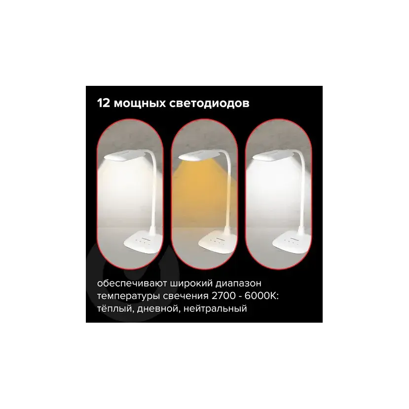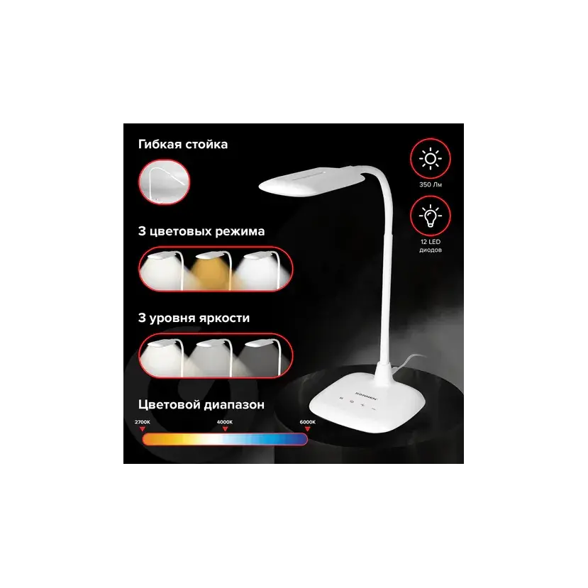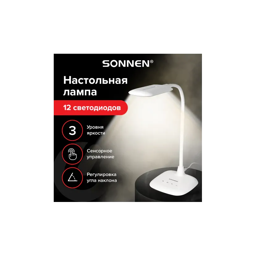 Настольная лампа-светильник SONNEN BR-819A является незаменимым атрибутом рабочего места. Прекрасно подойдет для школьника, студента, офисного менеджера. Настольная лампа-светильник высотой 31,5 см представлена в классическом белом дизайне, благодаря которому гармонично впишется в офисный или домашний интерьер. Устройство оснащено легким пластиковым корпусом и яркой LED-матрицей на 8 Вт. Вы будете довольны освещением с цветовой температурой от 2700 до 6000 K и световым потоком 350 Лм, которое обеспечивают 12 светодиодов. Прибор оснащен сенсорным выключателем. Благодаря 3 режимам свечения можно самостоятельно выбрать яркость света.
