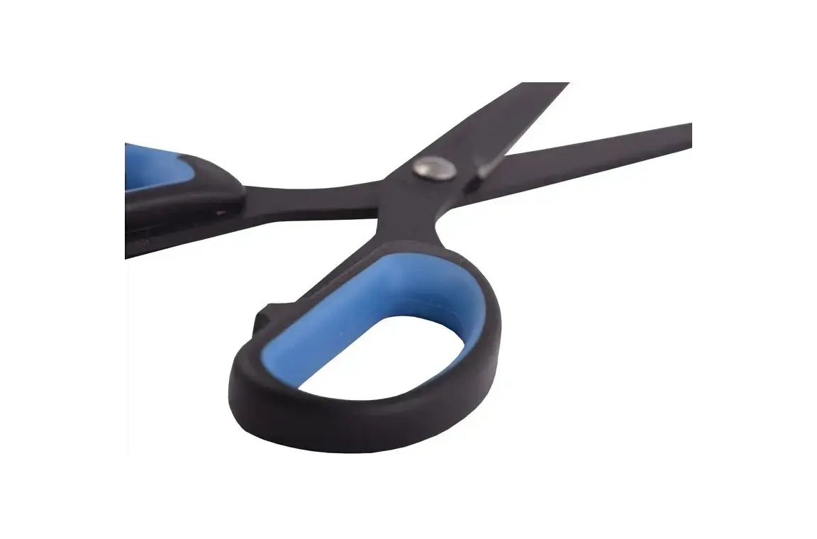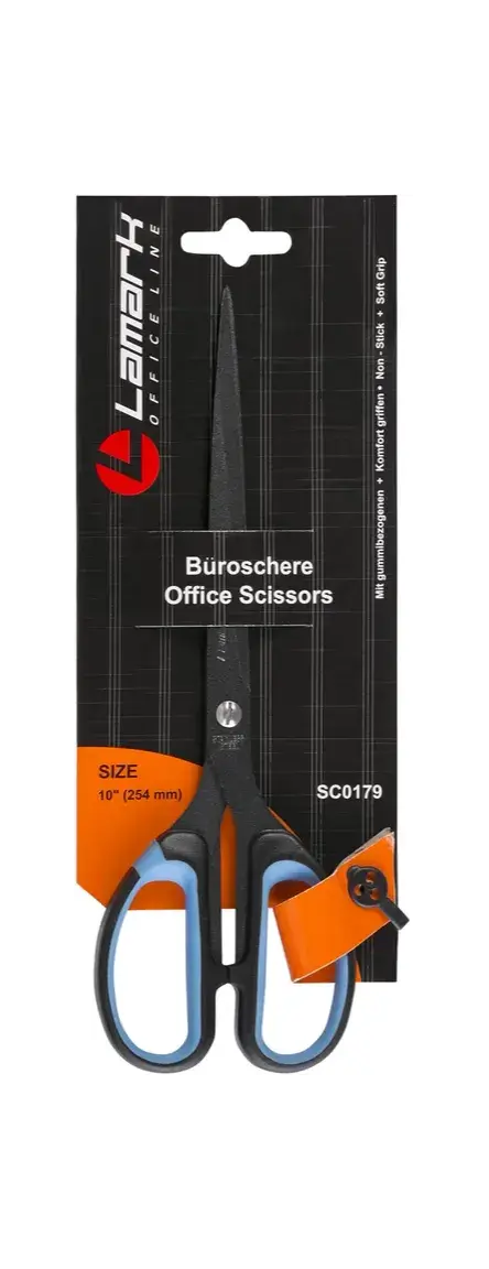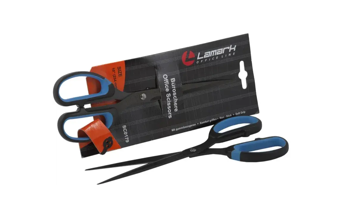 Ножницы канцелярские Lamark из нержавеющей стали с черным покрытием лезвий Non Stick. Эргономичные пластиковые ручки с удобным захватом с синими резиновыми вставками обеспечивают комфортную работу с материалами разной плотности. Размер ножниц 25,4 см. Поставляются в блистере с ерослотом.