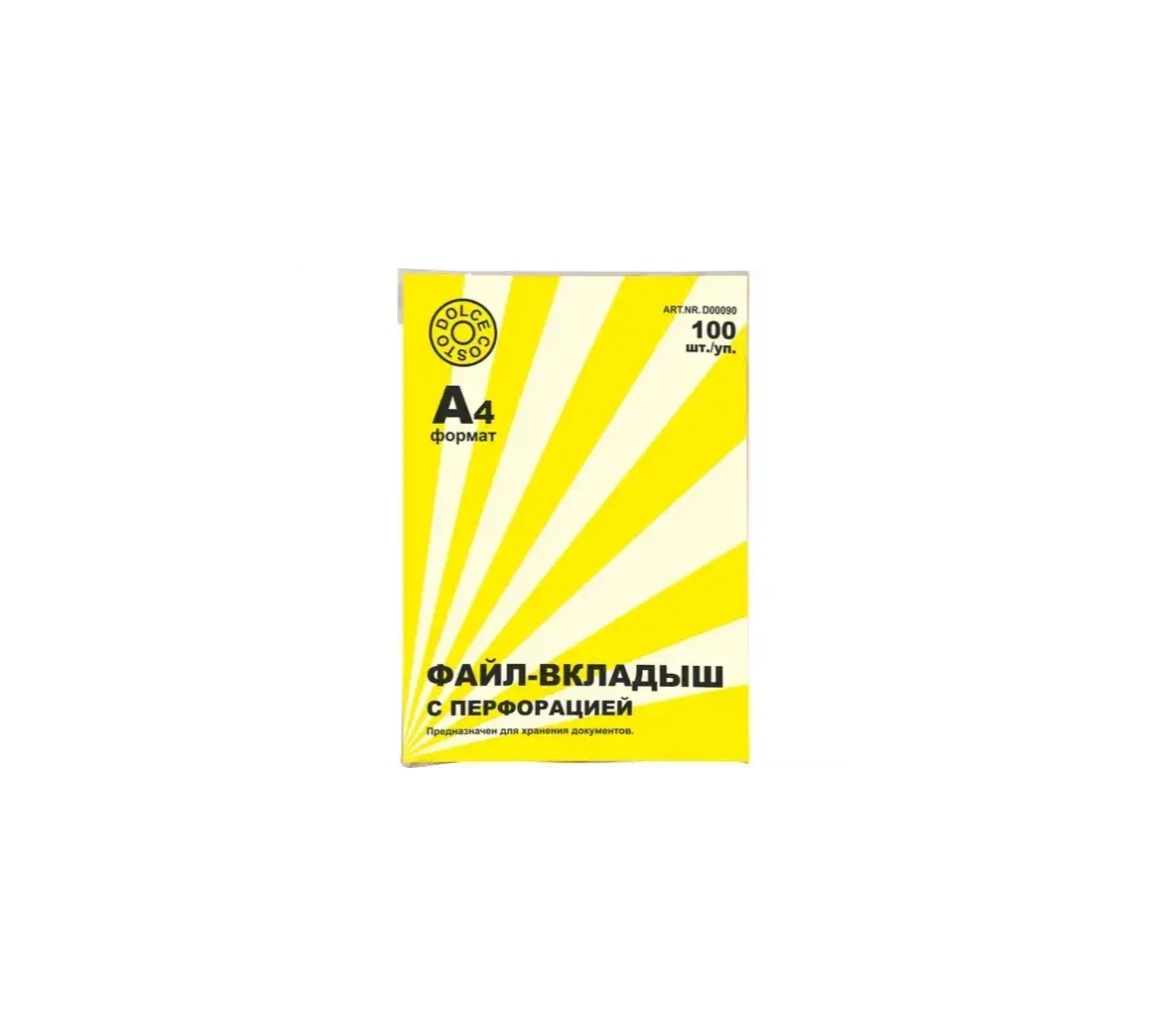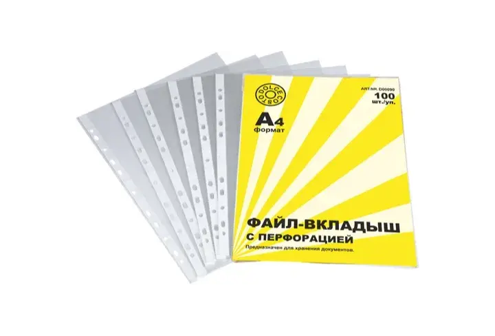 Файлы-вкладыши DOLCE COSTO Эконом выполнены из высококачественной полипропиленовой пленки толщиной 0,020 мм с фактурой поверхности “яичная скорлупа”, снабжены универсальной перфорацией, предназначены для хранения и транспортировки неперфорированных документов. 100 штук в упаковке.