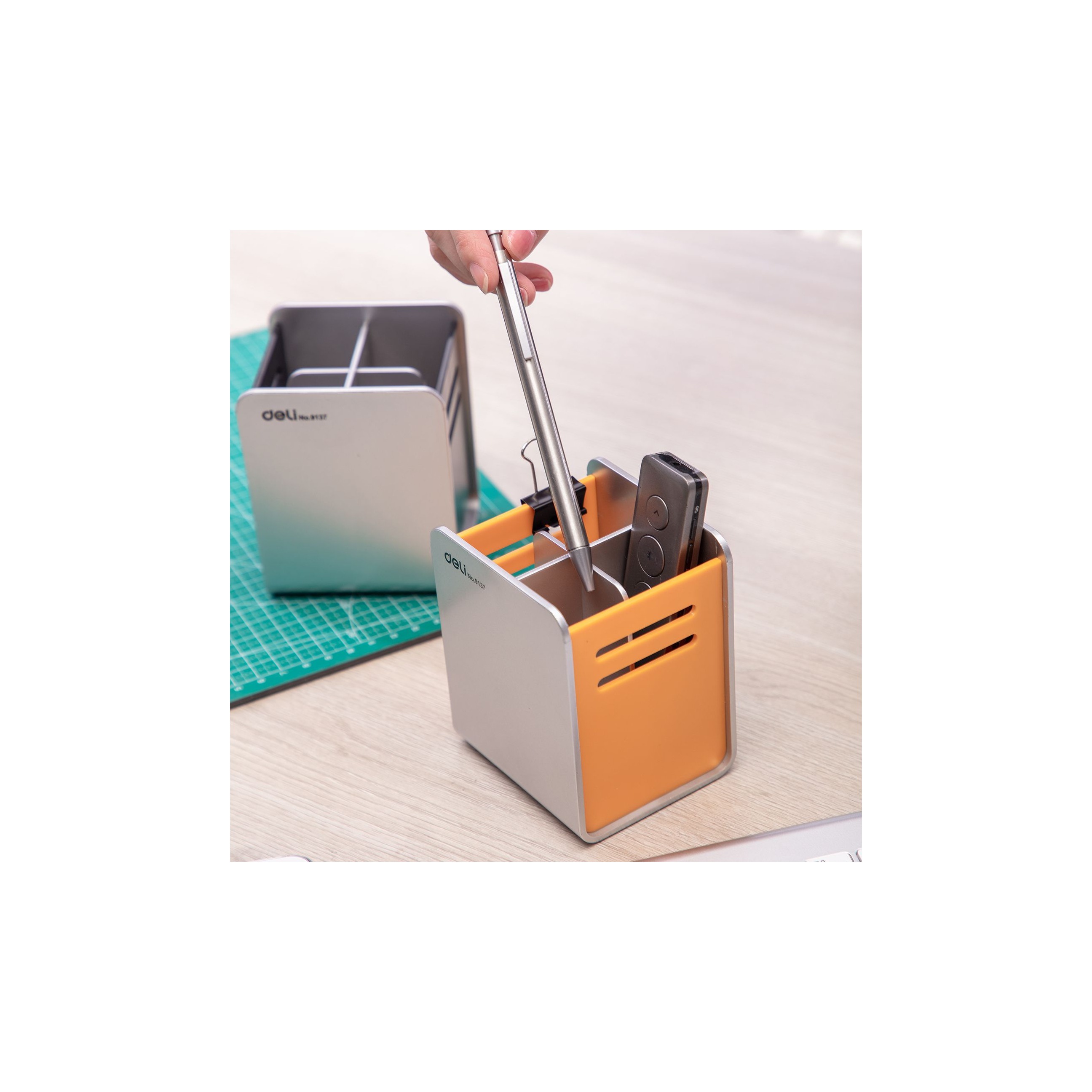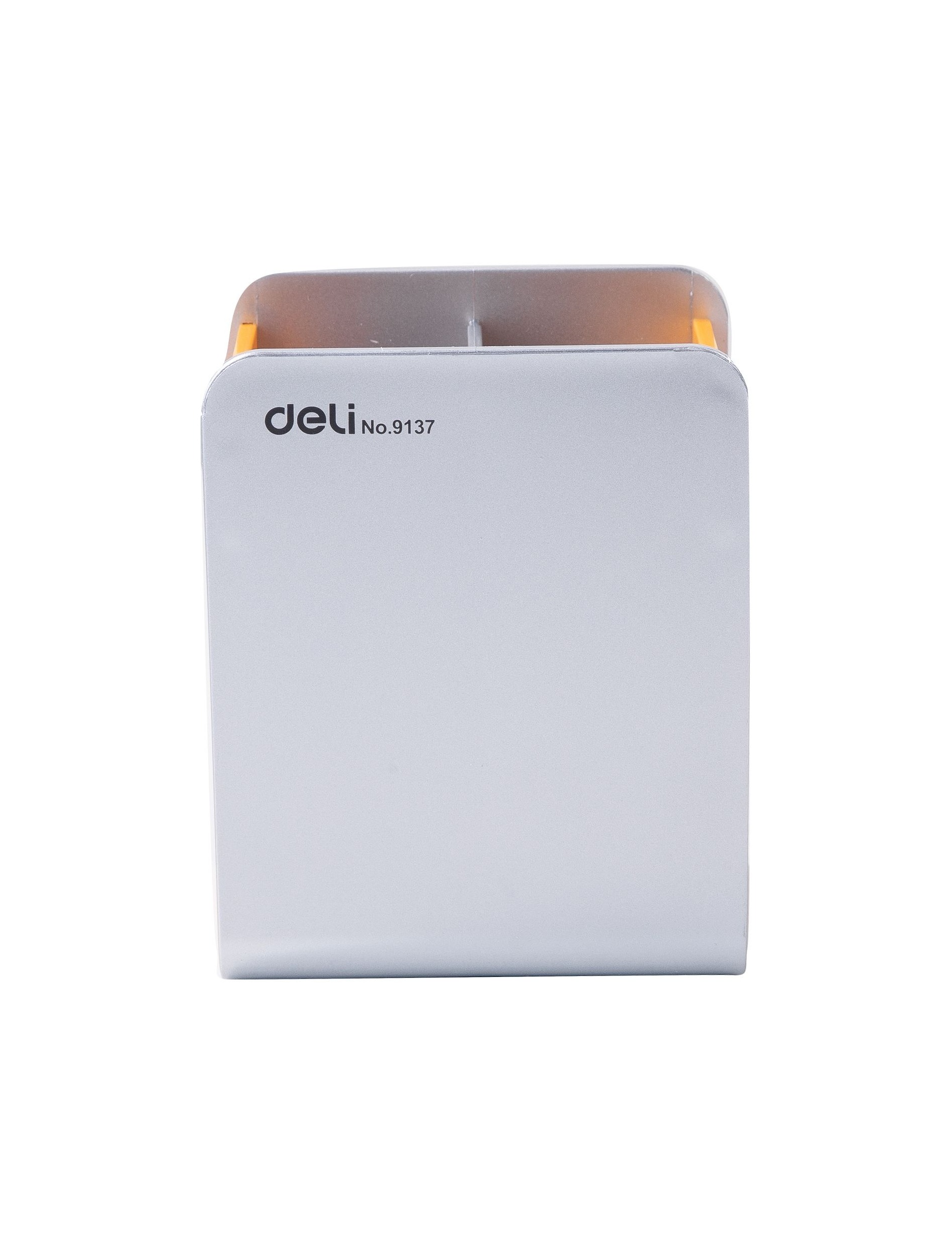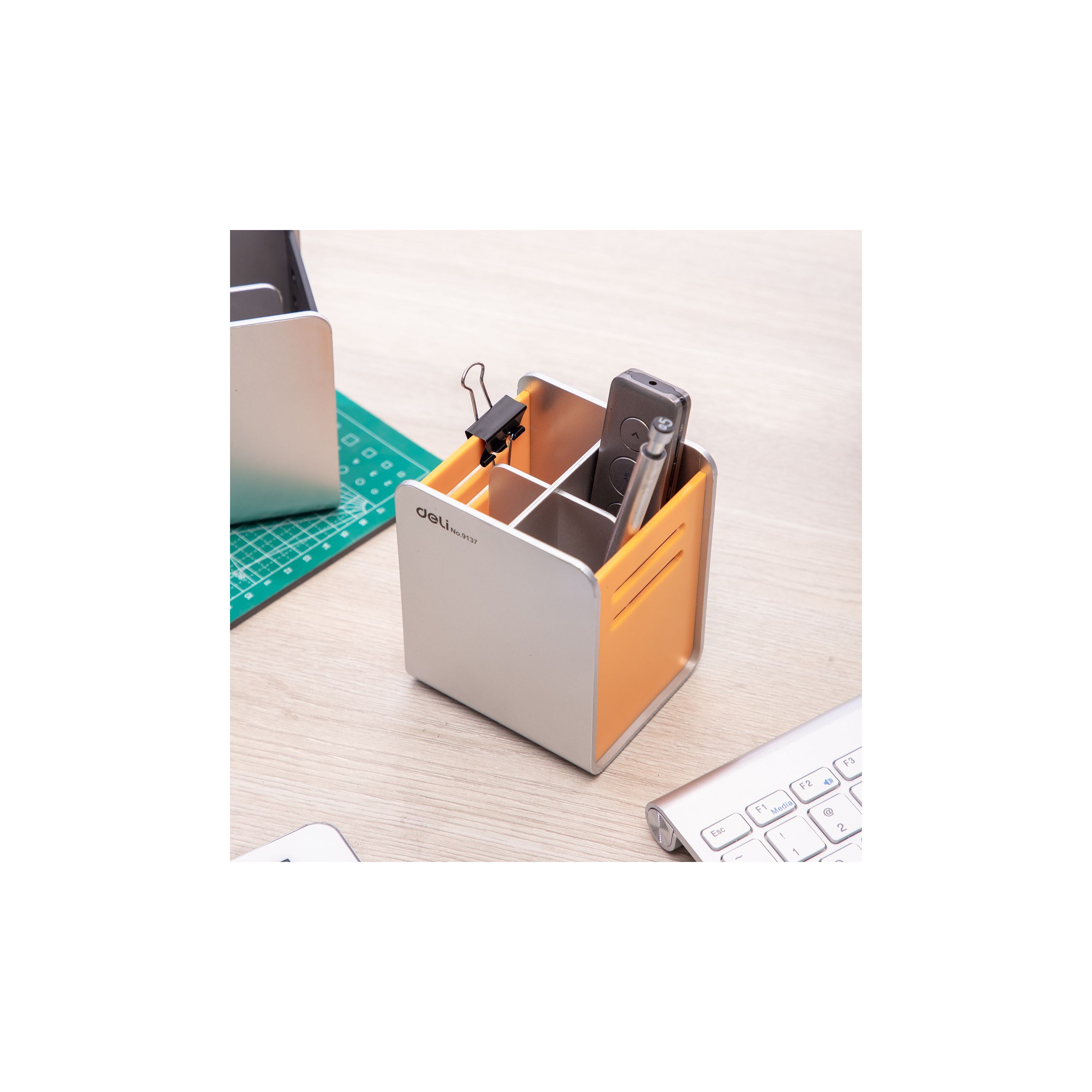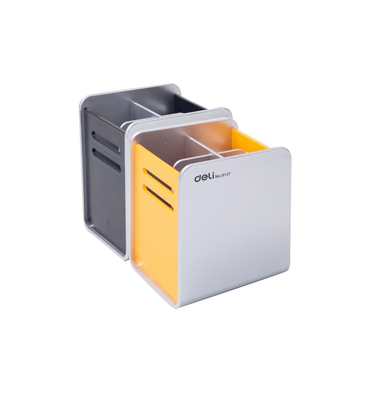 Подставка-органайзер для канцелярских принадлежностей Deli - незаменимый помощник для хранения письменных принадлежностей и канцелярских мелочей, а также создания порядка на рабочем столе. Эргономичная подставка-органайзер имеет 4 удобных отделения. Выполнена из качественного пластика. Размер изделия (ДхШхВ): 90х80х110 мм. Поставляется без наполнения. Не является вращающейся. Цвет серебро-желтый.