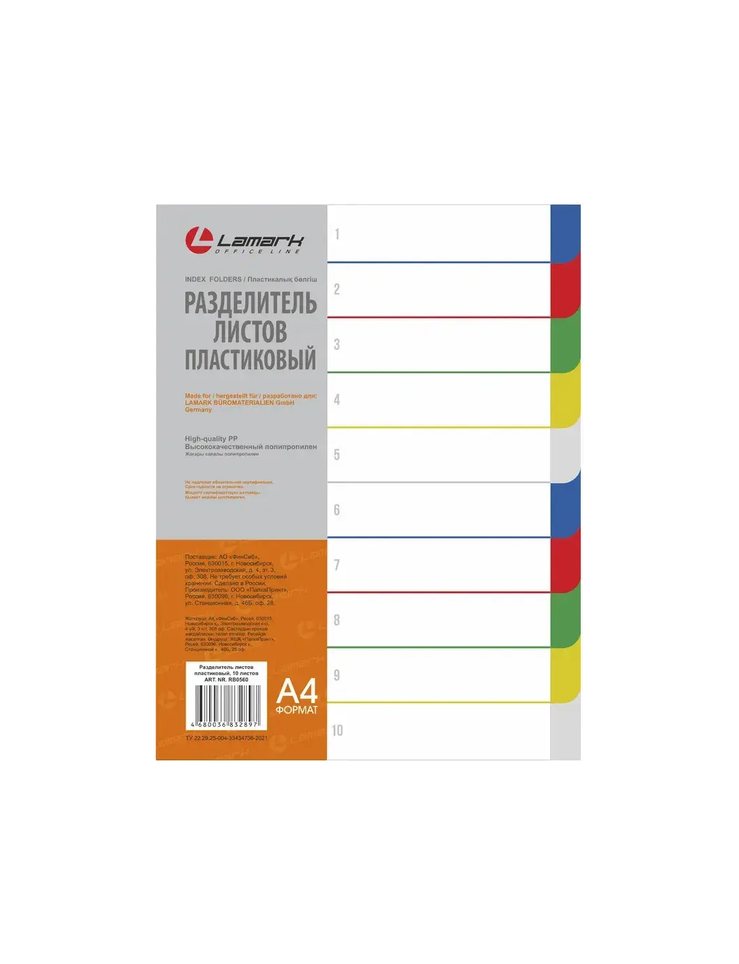 Индексные разделители Lamark формата А4 из плотного цветного пластика 0,14 мм с универсальной боковой перфорацией предназначены для классификации и систематизации документов, 10 листов. Высококачественный полипропилен (РР). Титульный лист с полем для записи в комплекте.