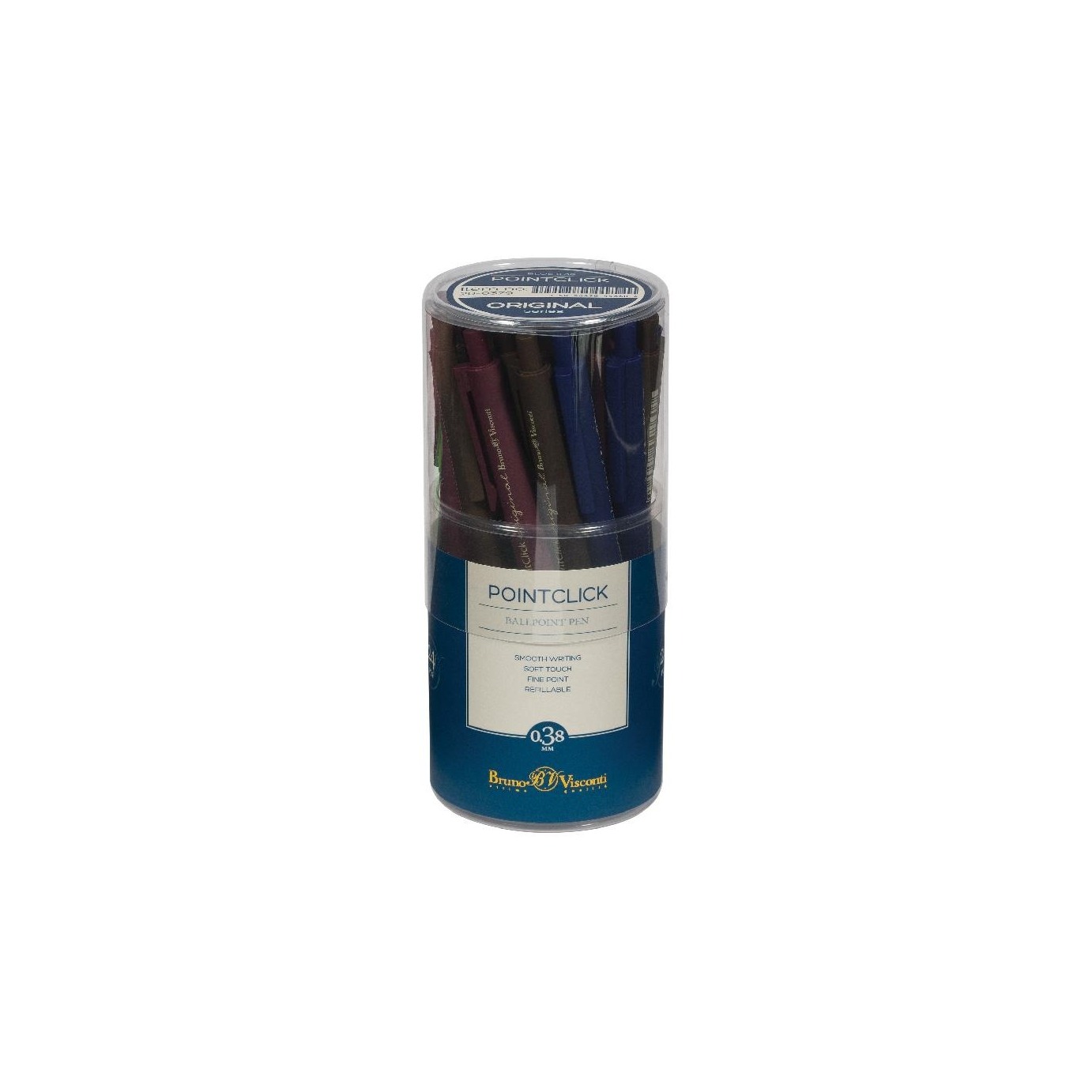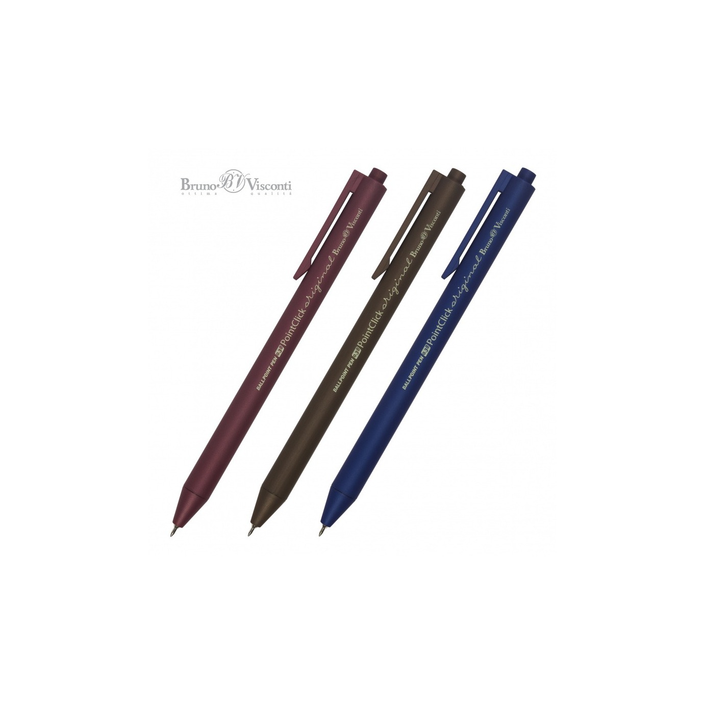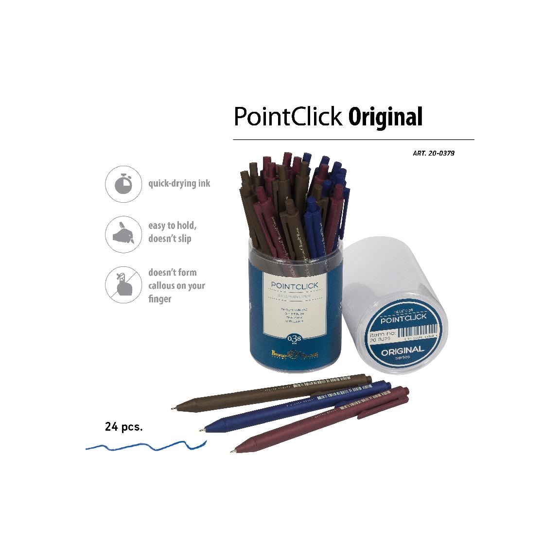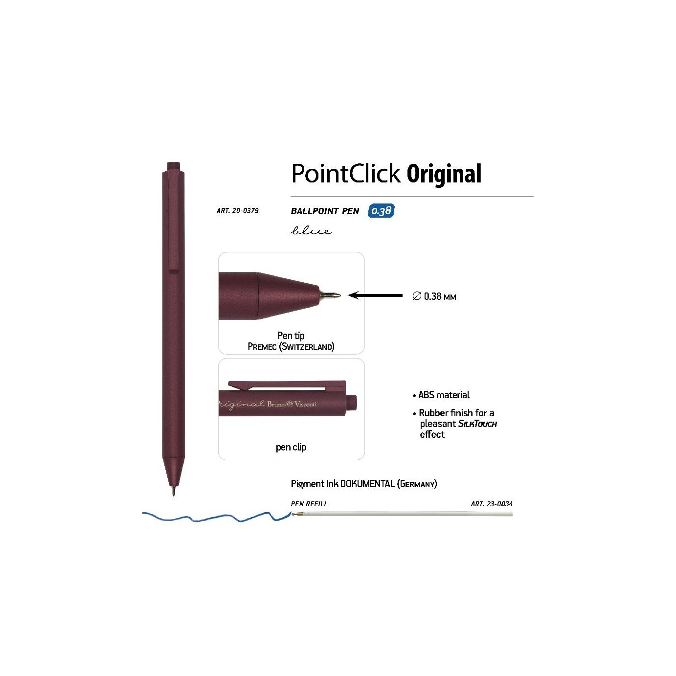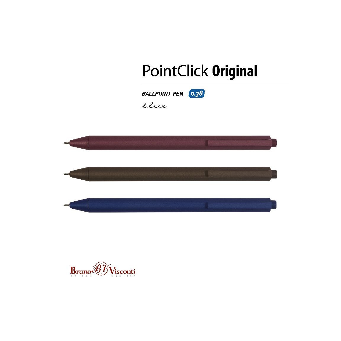 Ручка шариковая автоматическая BrunoVisconti® 0.38 мм, синий PointClick Original Арт. 20-0379 Автоматическая шариковая ручка PointClick ТМ Bruno Visconti для поклонников каллиграфического почерка и тонкого письма. Надежный пишущий узел от швейцарского производителя Premec обеспечивает плавную и бесперебойную подачу чернил, произведенных в Германии (DOKUMENTAL). Поэтому чернила ложатся на поверхность бумаги плавно, без давления на ручку. Толщина линии письма - 0,36 мм – яркая, четкая, тонкая, а ее длина составляет 1750 метров. Прорезиненный корпус тактильно приятный и создает дополнительный комфорт при письме.