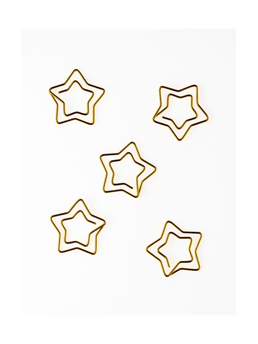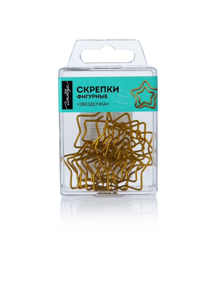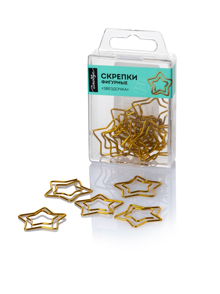 Фигурные канцелярские скрепки-звездочка цветные. Длина 30 мм. Прочно скрепляют бумагу и не повреждают ее. В удобном евробоксе 12 скрепок. Цвет золотой.